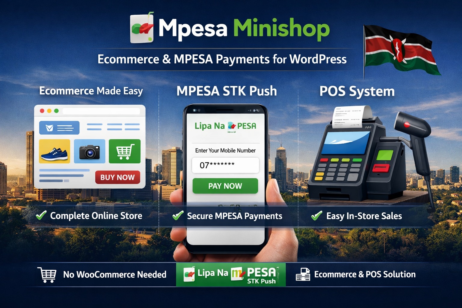 Mpesa Minishop is a complete MPESA STK Push payment solution for WordPress, designed to power Mpesa ecommerce stores and POS systems in Kenya. Businesses can accept MPESA payments directly on WordPress without WooCommerce, making it ideal for online shops, physical stores, and service-based businesses.